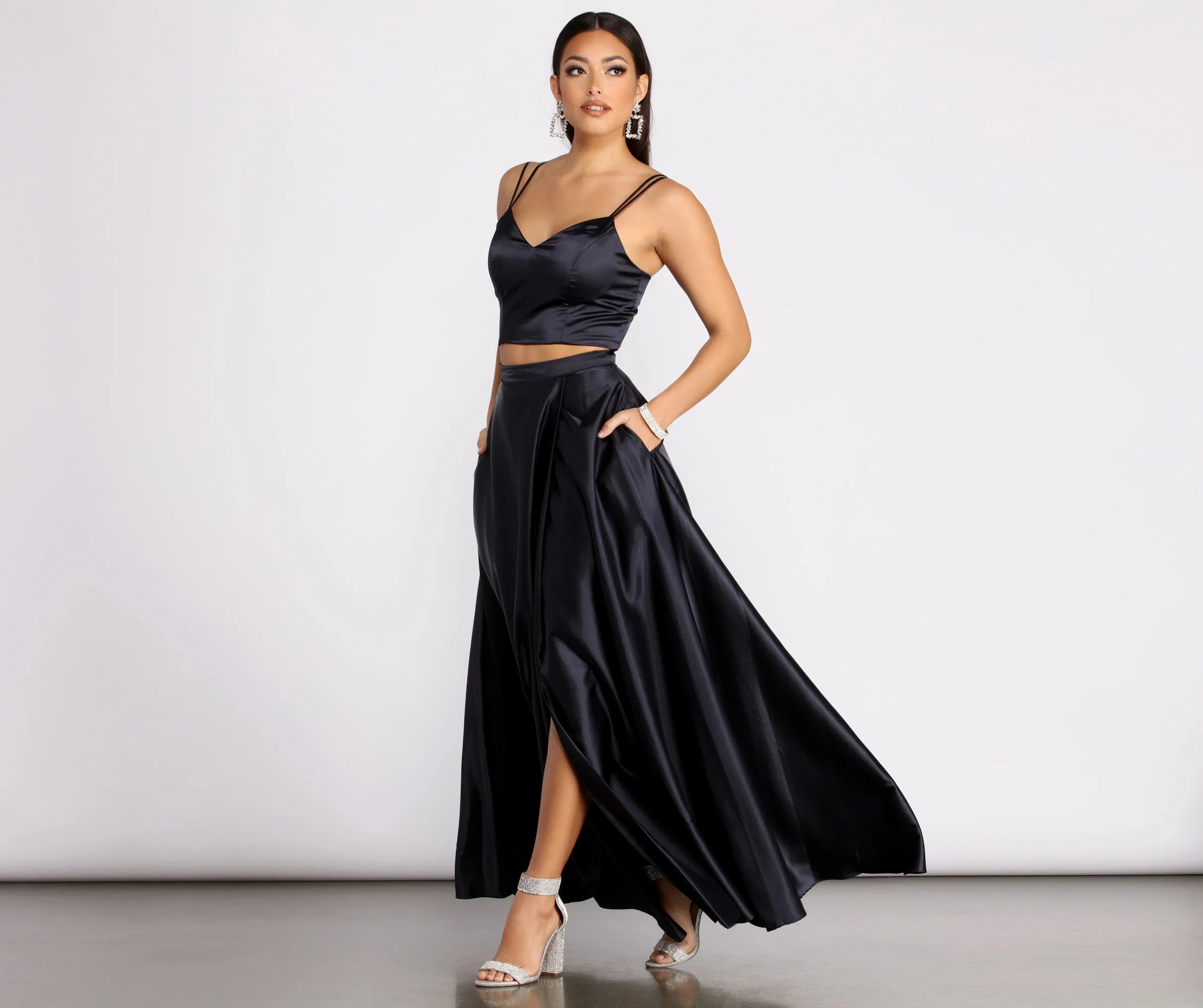 Walk into any room and look effortlessly chic in our beautiful Naomi! Her two-piece design is crafted from sleek satin that shines at every angle. One of her best features is her hidden hand pockets, perfect for storing any touch-up tools!