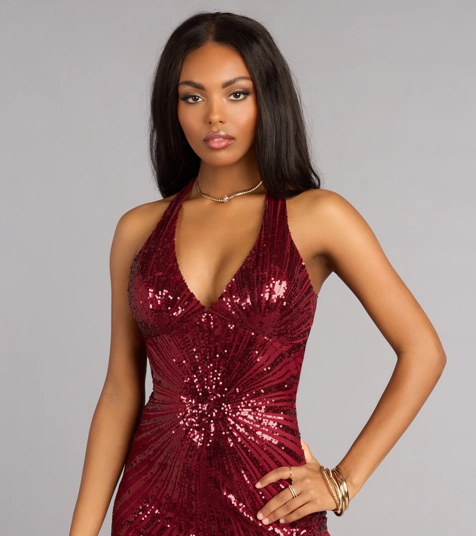 When the spotlight hits, the Rosaline dress does the rest. Designed with a geometric sequin pattern, a sculpted mermaid silhouette, and a daring front slit, this gown delivers high-impact shine with a sleek, confident edge that feels made for a grand entrance.