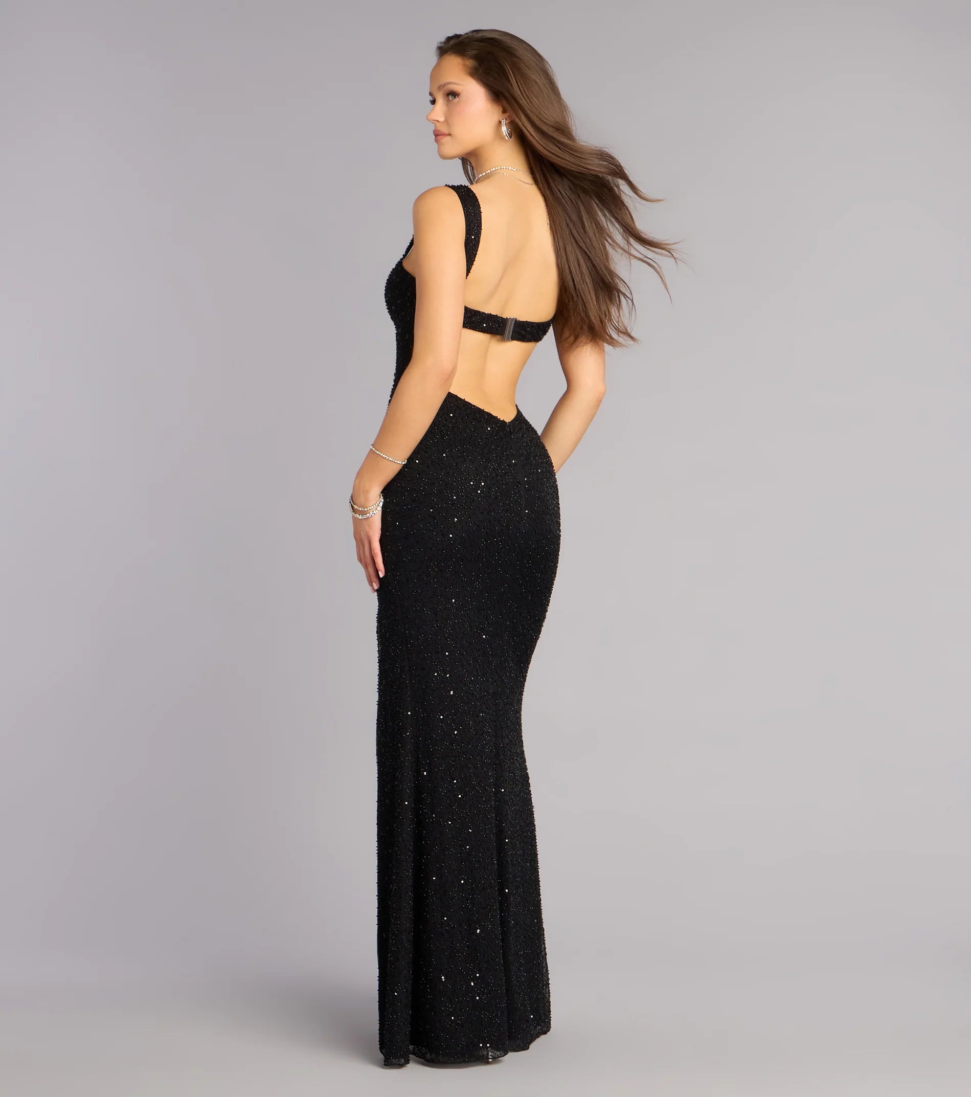 The Sonia gown is designed for the kind of entrance that turns heads before you even say hello. This mesh mermaid dress features tank straps, a sculpted silhouette, and a dramatic open strappy back, while the front slit adds just the right amount of movement for every step across the room.